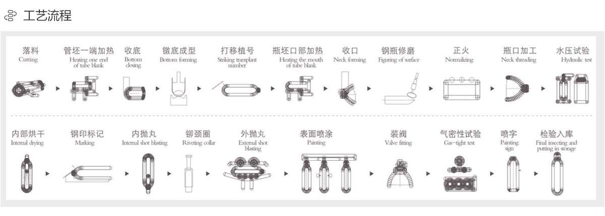 鋼質無縫氣瓶利用國際加工設備、先進的工藝流程制造而成,公司采用鋼管旋壓收口式加工方式,既保證了氣瓶壁厚,又讓氣瓶美觀雅致。